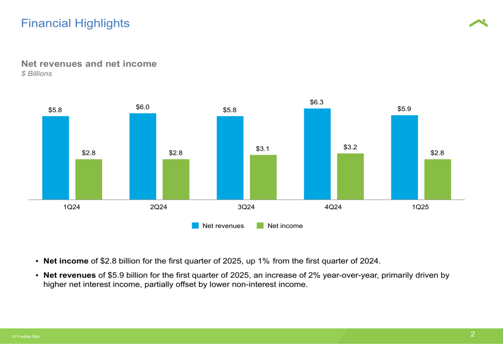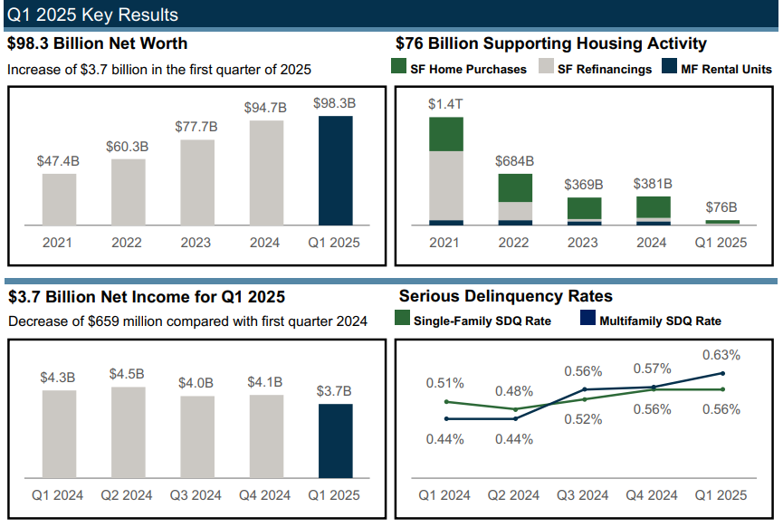 Key Financial Metrics (Q1 2025): Fannie Mae earned $3.7 billion and Freddie Mac $2.8 billion in quarterly net income, reflecting steady guaranty fee revenues on their $4.1 trillion and $3.6 trillion mortgage credit books, respectively. Net worth has grown ~20% year-on-year for each GSE (Fannie $98.3 billion; Freddie $62.4 billion). Credit quality remains strong (average loan-to-value ~50% for Fannie’s single-family loans, 0.56% serious delinquency).