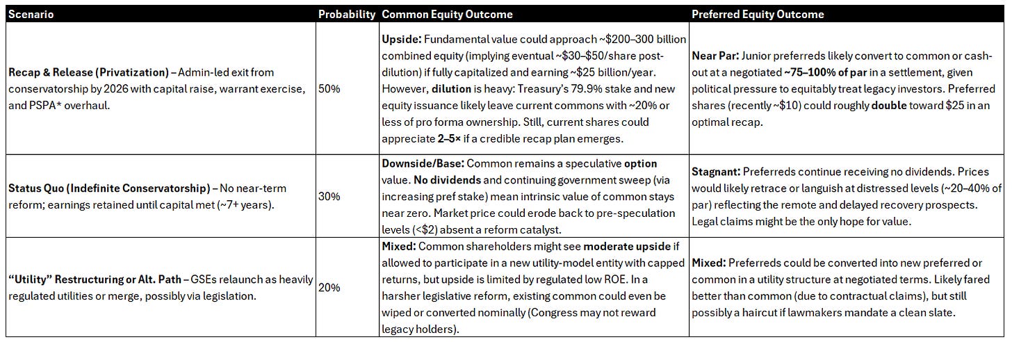 Preferred shareholders likely have a more defined outcome: in a successful recap, we expect a recovery of 75–100% of par value for junior prefs via conversion or settlement. Owning a Fannie or Freddie preferred at $10 today (par $25) offers a potential +150% to +>200% return to par. We find it probable that any solution will treat preferreds relatively generously (politically easier to justify paying par to mom-and-pop holders of income securities, and legally prudent given the contract rights). Thus, preferred shares have a high probability of at least doubling if recap occurs. Their downside in a failure scenario is also significant (they could languish or be wiped in extremis), but they might retain some trading value even in status quo (as they have). Risk/reward on preferreds is somewhat more conservative than common – less upside but still very attractive if you assume a >50% chance of release. As a bonus, if recap succeeds, eventually those preferred could resume dividends (~5–8% yields), or their conversion to common could itself provide additional upside if common appreciates thereafter.