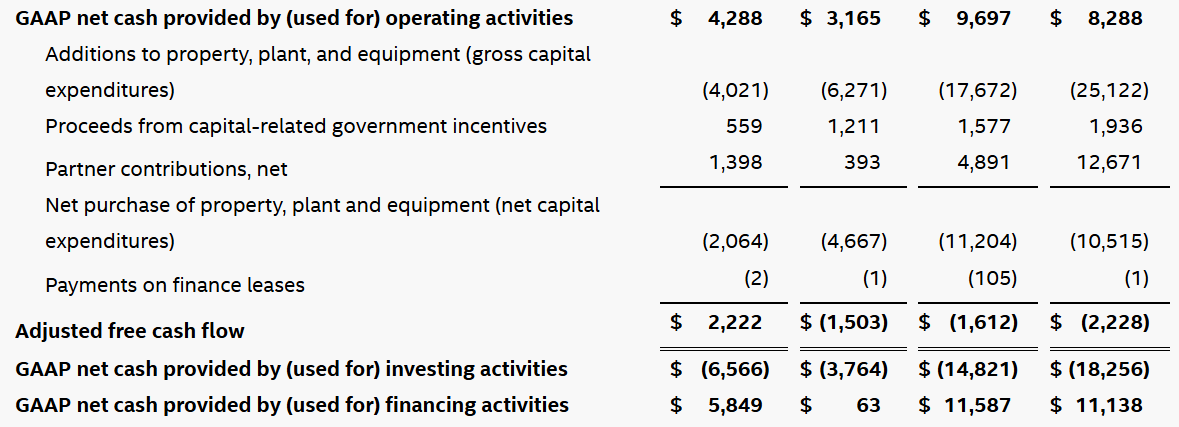 The company did generate $9.7 billion in operating cash for the full year[32], thanks to working capital improvements and cost cuts, but it heavily reinvested in fab capacity and received government offsets. Capital expenditures (additions to property, plant and equipment) were on the order of $20 billion in 2025, though net capex was lower after about ~$1.6 billion in government grants (e.g. CHIPS Act funds) and partner contributions[33][34]. Intel slashed its dividend to practically zero in 2023 to conserve cash (trailing 12-month dividend was just $0.04/share)[35], underlining its capital-intensive focus.