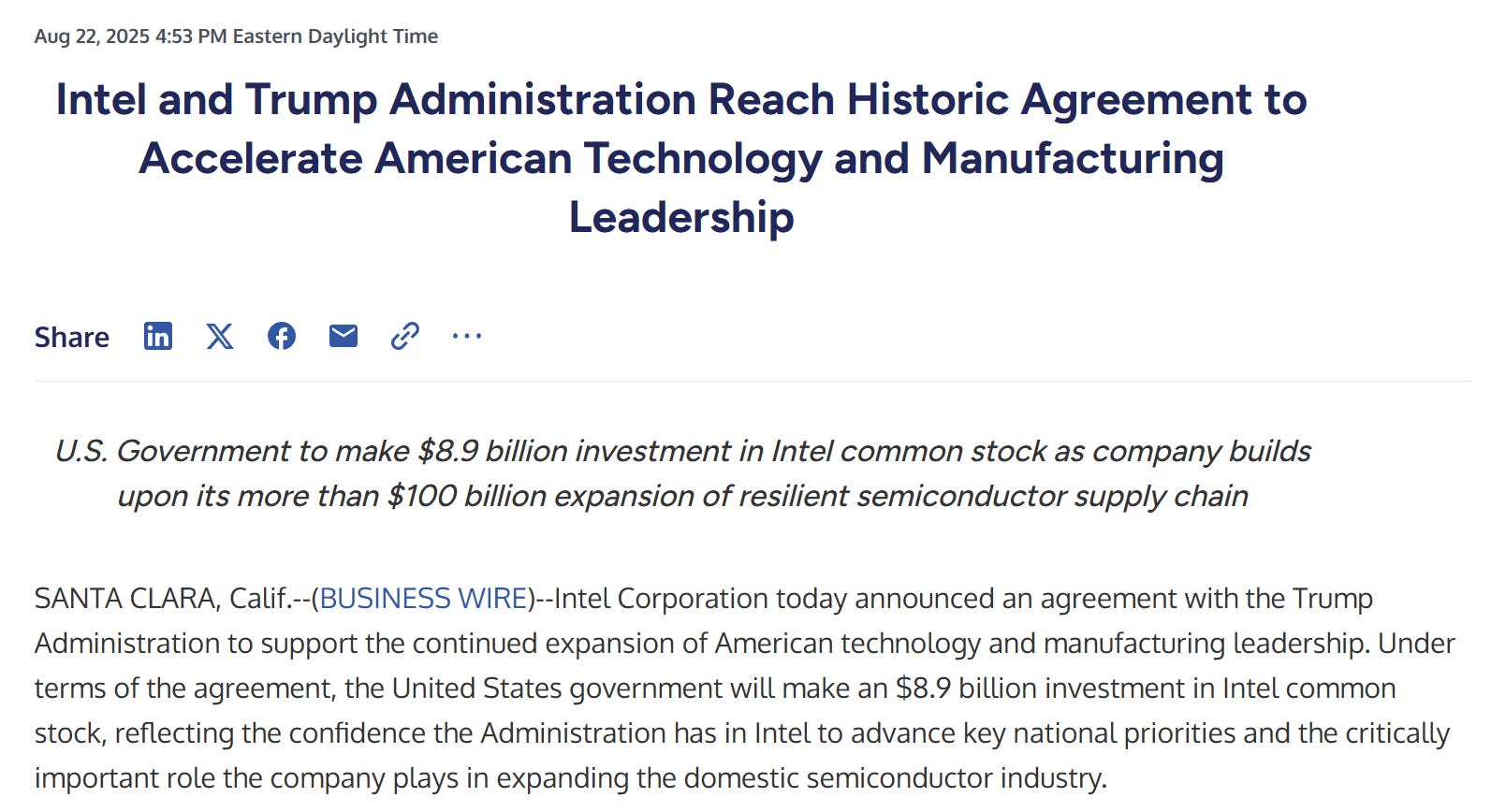 The U.S. government’s 9.9% ownership (now the largest shareholder) also changes the setup: it provides something of a backstop both psychologically and literally (the government paid ~$20.47/share for their stake[71][72], which could be seen as a floor in a dire scenario, and politically there may be moves to support Intel if needed). Intel has thus become part of the “MAGA trade” – a stock championed as aligned with the U.S. industrial policy zeitgeist. Under the Trump Administration, it’s not just a company but a strategic asset; this has drawn in a new class of investors who see patriotic or policy-driven upside, which can buoy valuation beyond pure fundamentals. However, one must be cautious: trading on politics can cut both ways (e.g. future administrations or public backlash could impose constraints).