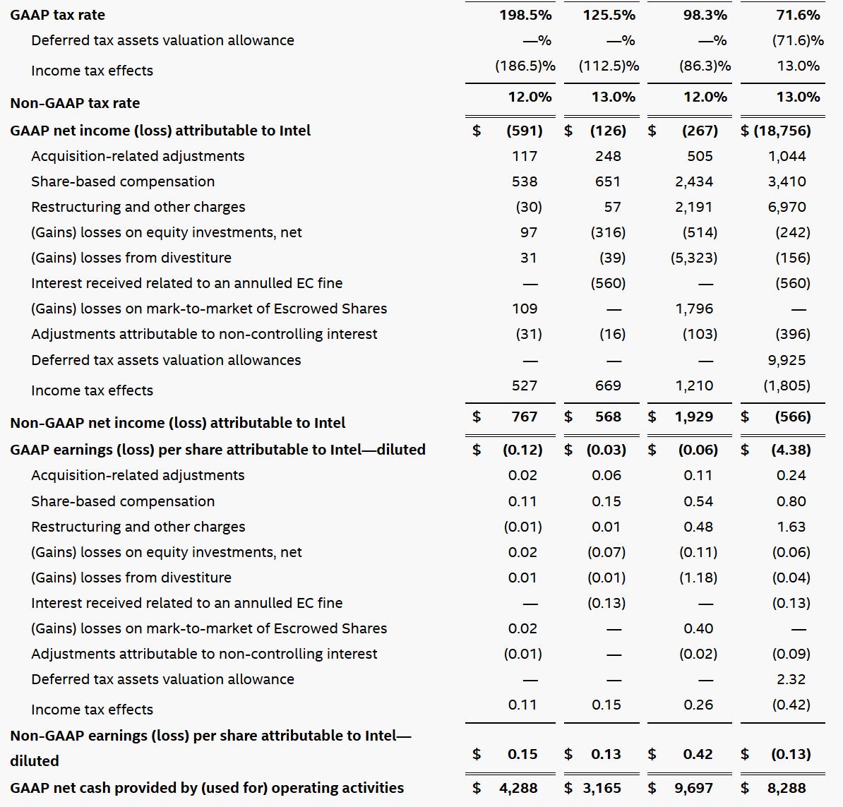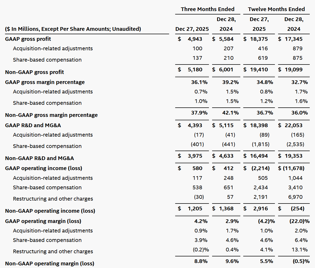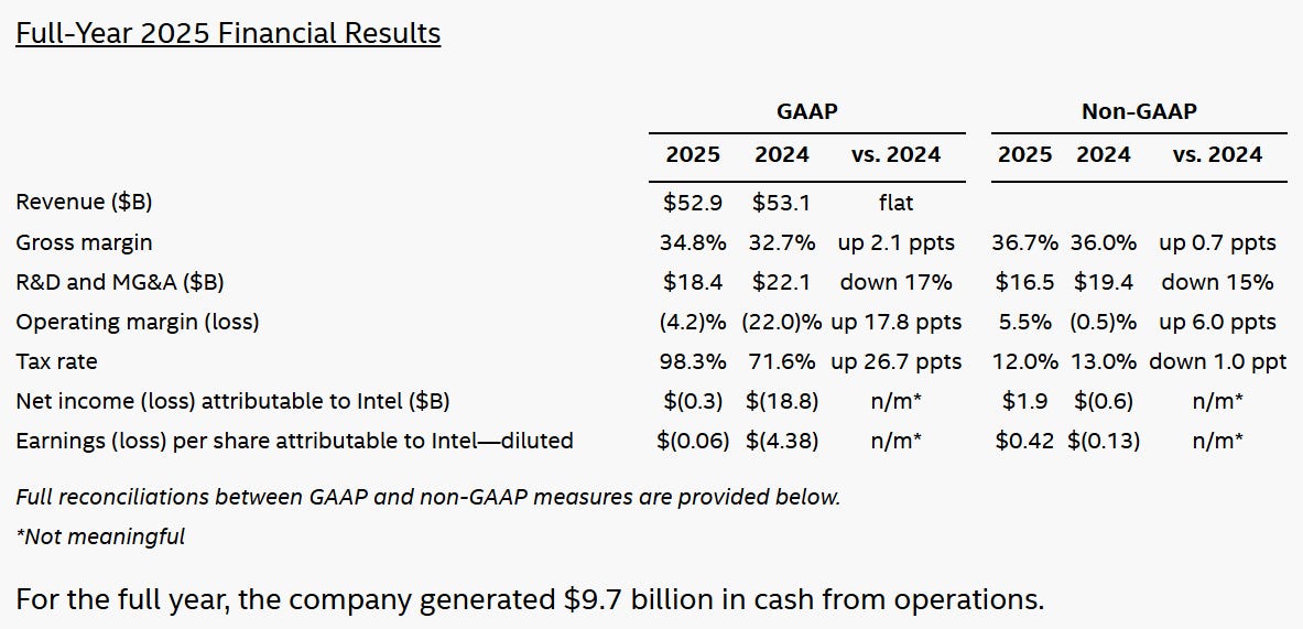 Gross margin was 34.8% (GAAP) for 2025 (36.7% on a non-GAAP basis)[27] – depressed by underutilized factories and start-up costs on new process nodes, and far below Intel’s historical ~55–60% gross margins. Operating income was roughly breakeven: a $(0.3) billion GAAP net loss for 2025[28], though on an adjusted basis Intel eked out $1.9 billion in net profit[29].