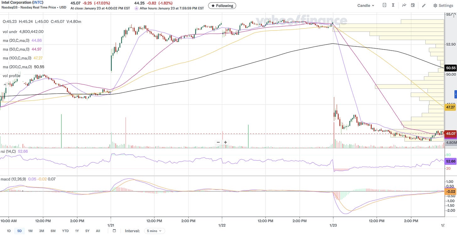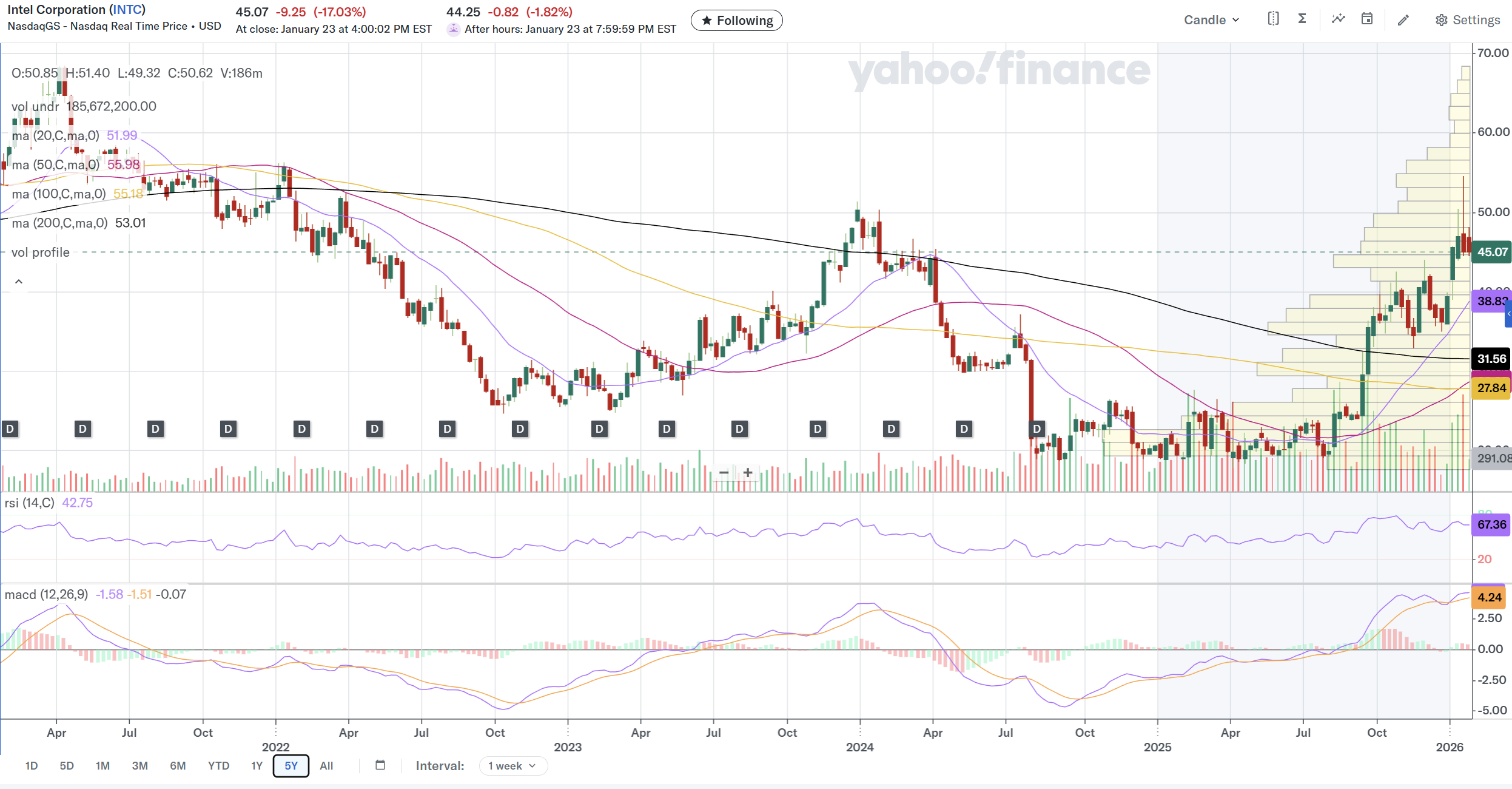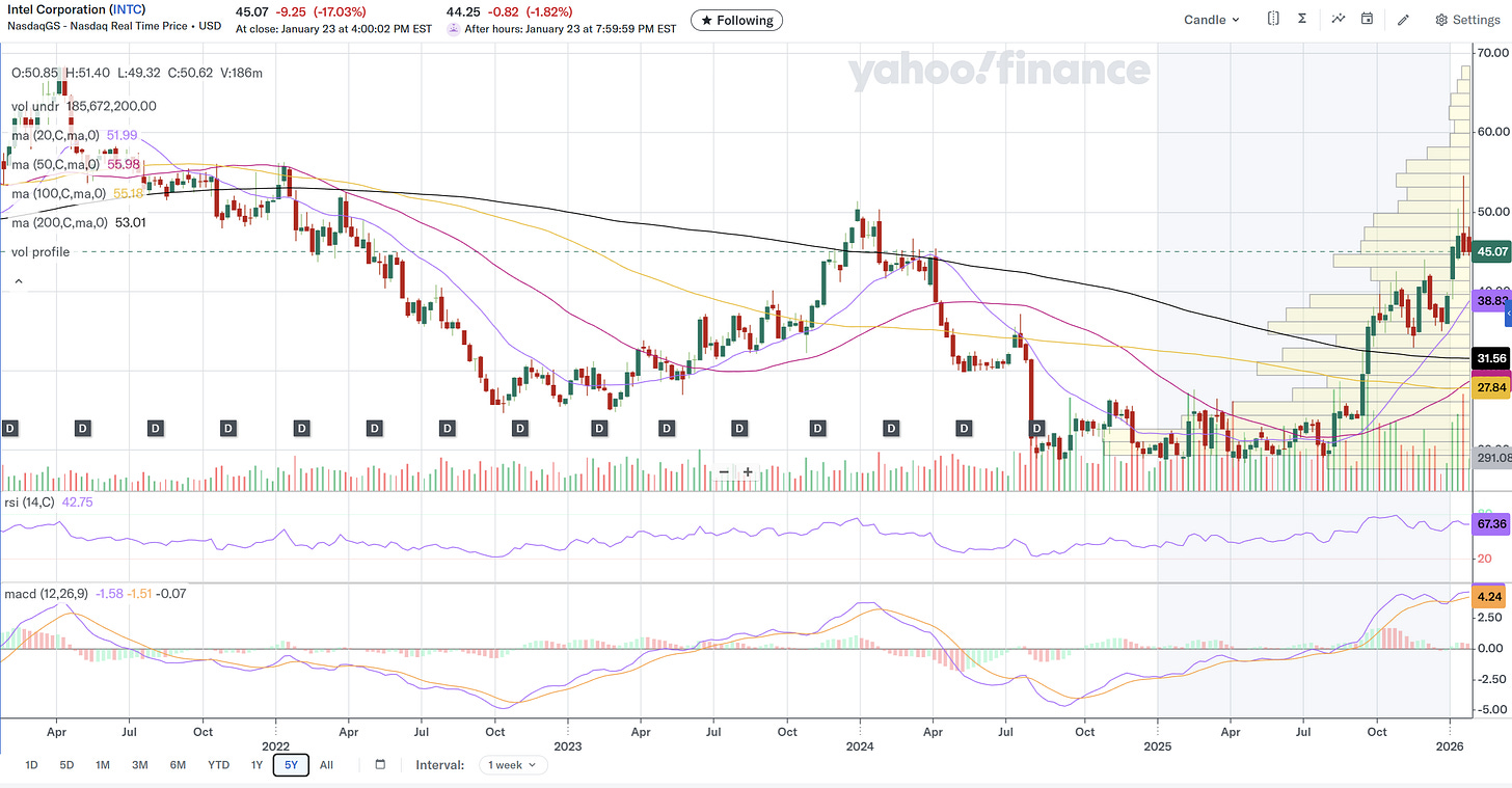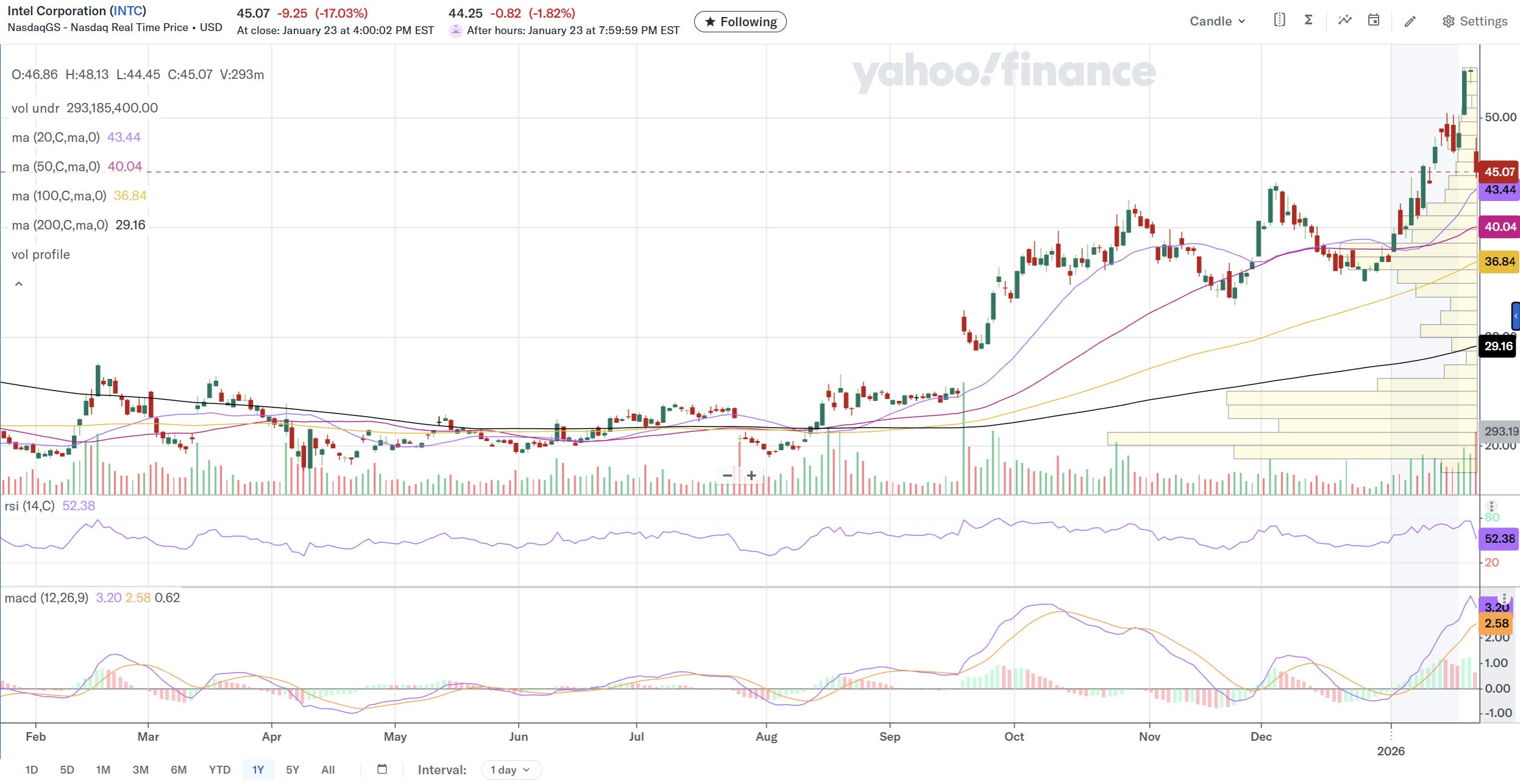 Intel’s stock has been in a strong uptrend since mid-2025, but is now encountering some volatility around key levels. After a steady climb, the stock hit a 52-week high of $54.60 in January 2026[1], reflecting bullish momentum into the Q4 earnings report.