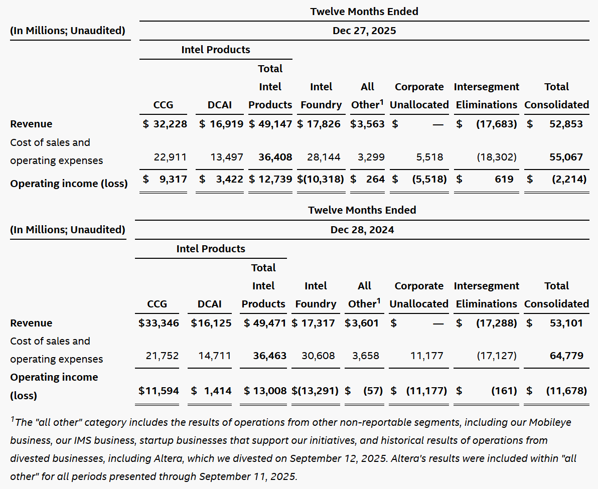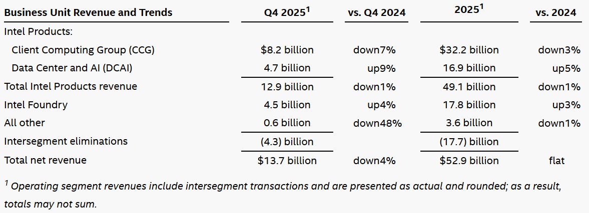 These two segments generate the bulk of Intel’s economic value, historically with data center chips commanding the highest margins.