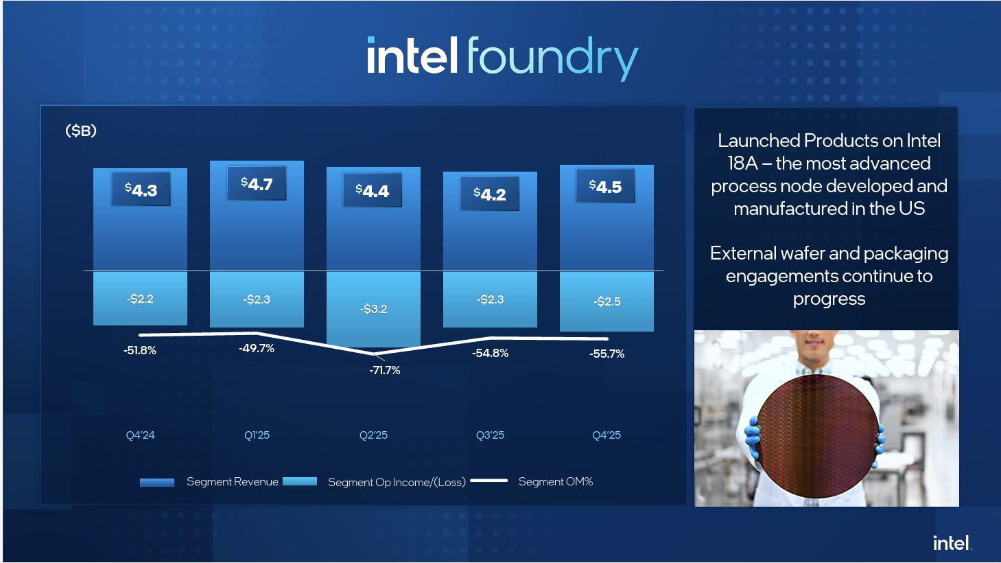 Realistically, though, in the next couple of years foundry will be a drag on margins because Intel is essentially incubating a business: current external foundry revenue is minimal and the segment is incurring huge startup costs (e.g. duplicate PDK development, customer support engineering). Indeed, Intel’s “Intel Foundry” segment in 2025 had an operating loss of about $10 billion on ~$18 billion revenue when viewed standalone[24][45]. This reflects heavy fixed costs (new fabs, EUV tools, overhead) that are not yet absorbed by third-party volume. The company expects this to improve as they onboard customers; they even noted that advanced packaging services have seen early customer pre-payments due to tight substrate supply – a positive sign of monetization via upfront cash[46][47].