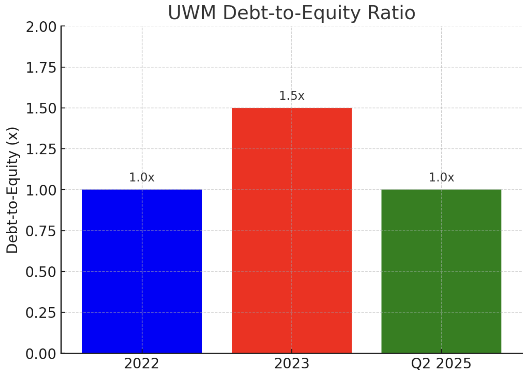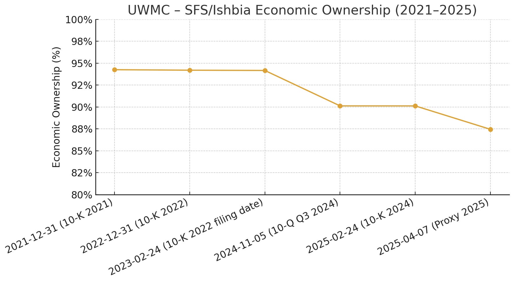 Looking at debt market access: UWM issued a 5.50% $700M 5-year senior unsecured bond in 2021 (due 2026) and a 5.75% $500M bond due 2027. Those rates were low at the time. Those bonds likely trade at yields above 5.5% now due to higher rates and sector spread, but UWM’s credit profile remains solid (no history of defaults, strong market position). If needed, UWM could raise debt again (albeit at higher coupons, probably high-single-digit yields today). Equity raises are unlikely given the structure - any new equity would have to come with Mat converting some of his interest, which he hasn’t shown inclination to do (and stock price in single digits is likely lower than what he’d accept for dilution).