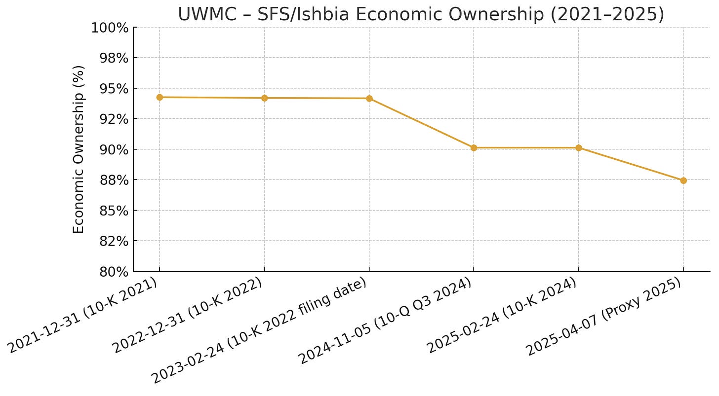 Management & Governance: Mat Ishbia (43) serves as Chairman, President, and CEO. He is a high-profile leader known for an intense, sports-driven culture (Mat is a former MSU basketball player under Coach Tom Izzo). His family retains majority control: Mat and trusts hold Class D shares representing ~94% of voting power. As of Feb 2025, UWM had ~1.598 billion shares outstanding split into ~158 million Class A (public) and ~1.44 billion Class D (privately held by SFS Corp, the Ishbia family entity)[22][23]. The Class D shares are economically equivalent and convertible into Class A, but carry extra votes to preserve control. This means public shareholders own only ~10% of economic interest and have minimal influence. Such governance concentration poses risks (minority investors must rely on Ishbia’s stewardship), but also aligns incentives - the Ishbia family has “skin in the game” to the tune of billions. Insiders benefit directly from dividends (Mat’s SFS Corp gets proportional distributions alongside the $0.10/share Class A dividend[24]).