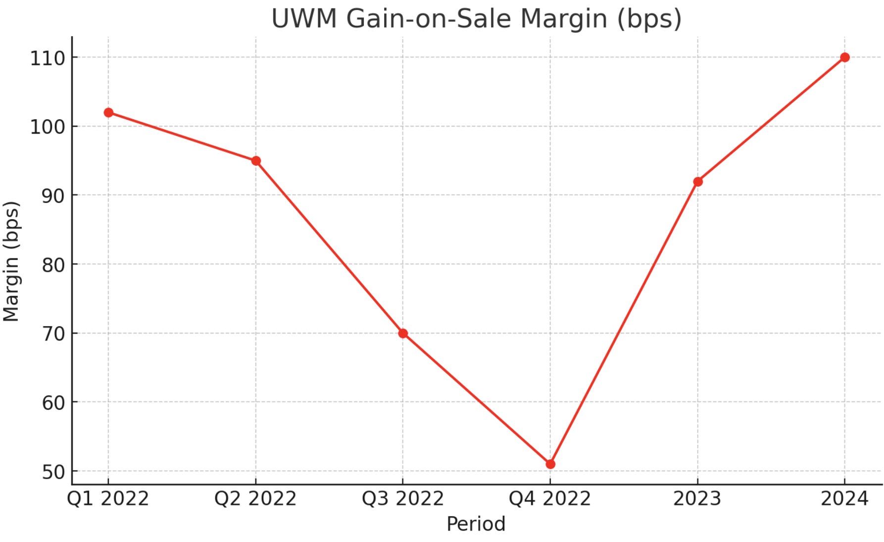 Margin Compression in Competitive Landscape: The mortgage business is notoriously competitive and low-margin. UWM’s strategy of undercutting rivals means there is always the risk someone tries to undercut UWM. If a deep-pocketed competitor (e.g., Rocket) decided to launch a price war in wholesale by subsidizing lower rates, UWM would be pressured to match, driving margins down. We saw how painful 50 bps margin compression was in 2022 (UWM’s margin halved to ~50 bps)[72][109]. While many competitors can’t sustain that, one might try selectively (for example, Rocket might offer promotions to brokers to lure them back, which could force UWM to respond). Also, new entrants could emerge if technology lowers entry barriers (though scale is needed for cost efficiency, one can’t rule out a fintech with investor backing trying to disrupt wholesale). Prolonged margin compression would directly hit earnings and could force UWM to scale back its dividend or growth investments.