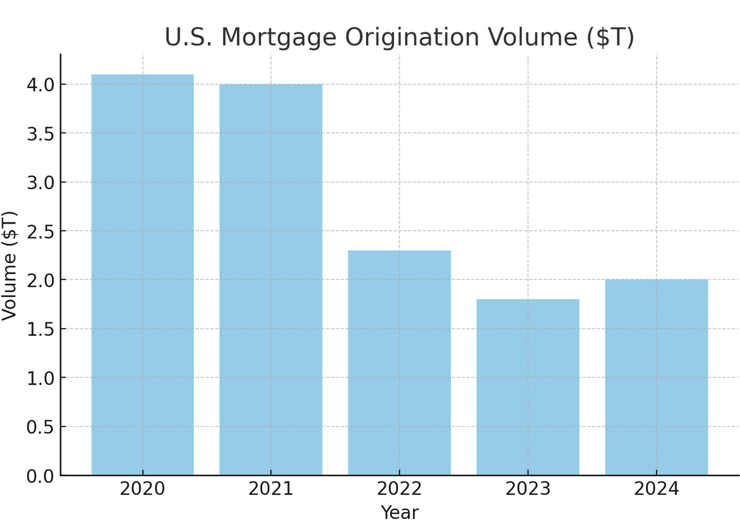 Origination Volume Cycle: The U.S. residential mortgage market is highly cyclical, swinging with interest rates and housing activity. After an unprecedented boom in 2020-2021, when 30-year mortgage rates hit all-time lows (~2.7%) and annual origination volume exceeded $4 trillion, the industry saw a sharp contraction. By 2022-2023, the Federal Reserve’s rapid rate hikes pushed mortgage rates to ~7-8%, crushing refinance demand and straining affordability for purchases. Total origination volume fell to ~$2.3T in 2022 and only ~$1.8T in 2023[34] - a steep drop (~50%) from the peak. 2023 in particular was extremely challenging: it saw the lowest existing home sales in roughly 30 years (5 million or fewer annualized) due to the “lock-in effect” (homeowners with 3% mortgages unwilling to move and give up low rates). Within this depressed market, purchase loans dominated (~75-80% of volume in 2023-24 were purchase mortgages, as refis dried up)[35][36]. Going into 2024-2025, industry forecasts (Mortgage Bankers Association, etc.) expect only a gradual recovery: purchase volume inching up with new home sales and first-time buyer programs, and refi volume remaining muted until rates drop more materially.