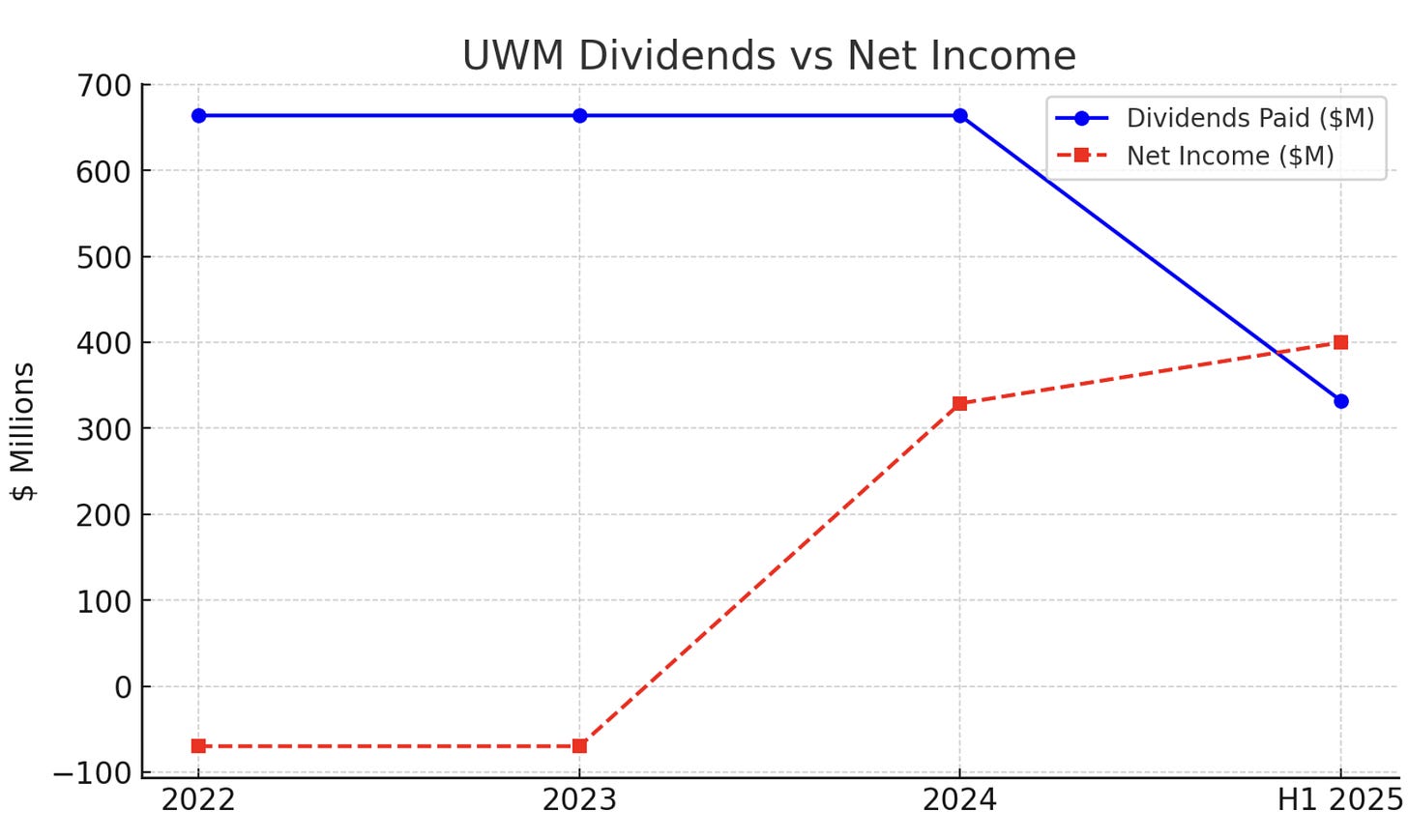 Capital allocation for UWM has been focused on dividends. The company committed to a $0.10/quarter dividend from its listing and has maintained it through ups and downs[7]. This yields ~6% annually at current stock prices - quite high. The dividend costs roughly $22M per quarter paid to Class A, but note that because of the Up-C structure, an equivalent distribution is paid to Class D (Ishbia’s entity) of around ~$144M per quarter[24] (since they own ~87% of total shares). So total cash outlay is ~$166M/quarter or $664M/year for dividends. This is substantial relative to earnings, and indeed in 2022-2023 UWM paid dividends even when GAAP net income was negative (they had positive operating cash flow though, and some historical profits to distribute). The Ishbias likely favored keeping this dividend to reward themselves and outside shareholders and to present UWMC as a yield play. We should scrutinize dividend sustainability: In 2023, UWM’s net loss was $70M, but adding back the non-cash MSR writedowns they had positive operating profit to cover the dividend (full-year adjusted net income was actually $490M before MSR marks[101]). In 2024, net income was $329M[23] which covers about half the $664M dividend; but UWM also had a large DTA shield (so minimal taxes) and some other adjustments, plus presumably some cash from MSR sales. As of mid-2025, with profitability restored (H1 2025 net income was substantial given Q2 alone $314M), the dividend seems secure in the short run. The company has not done share buybacks, probably because float is already small and Mat Ishbia doesn’t want to reduce it further (or use cash that way). No significant M&A has been done either (they prefer organic growth; they did buy some small tech assets but nothing major).