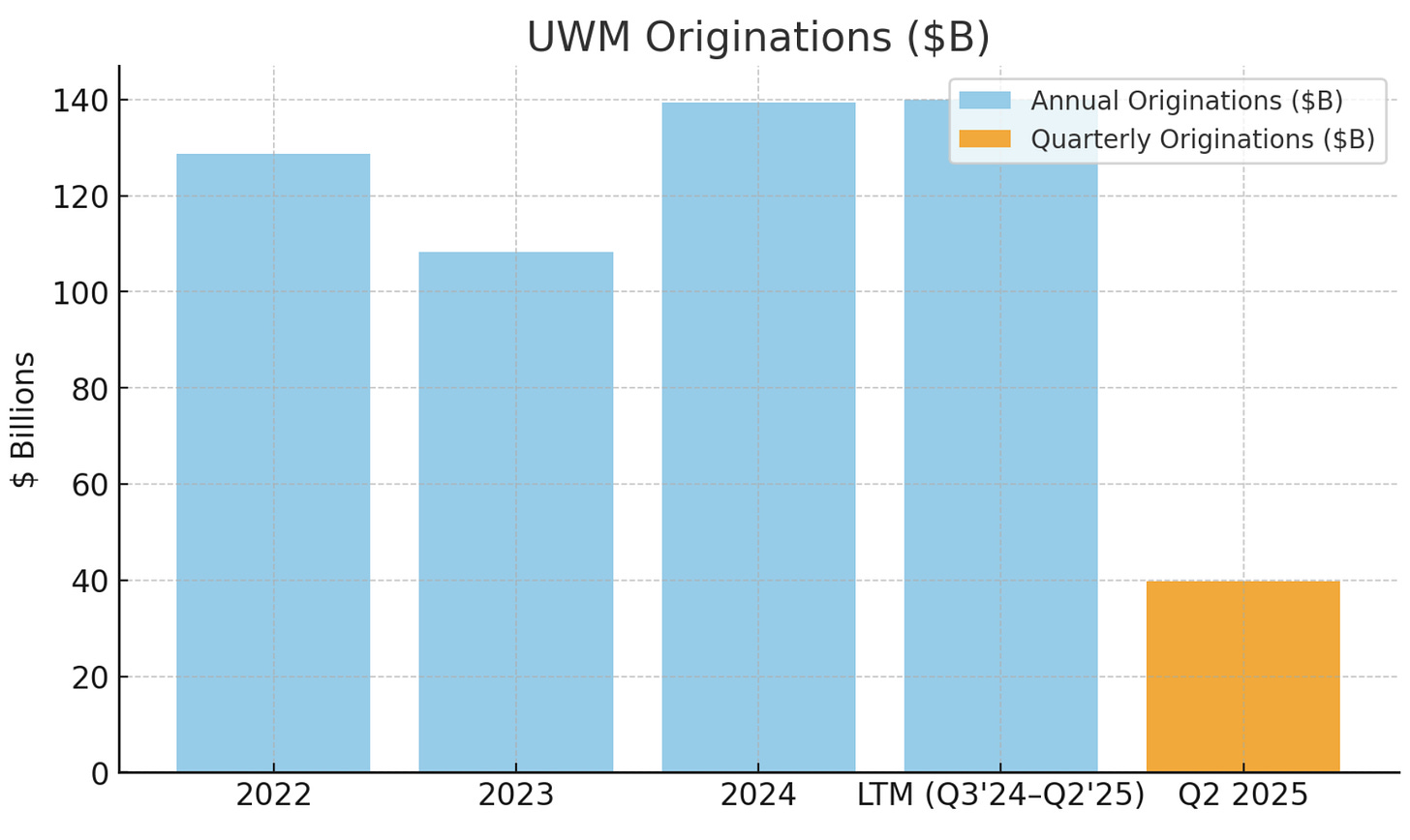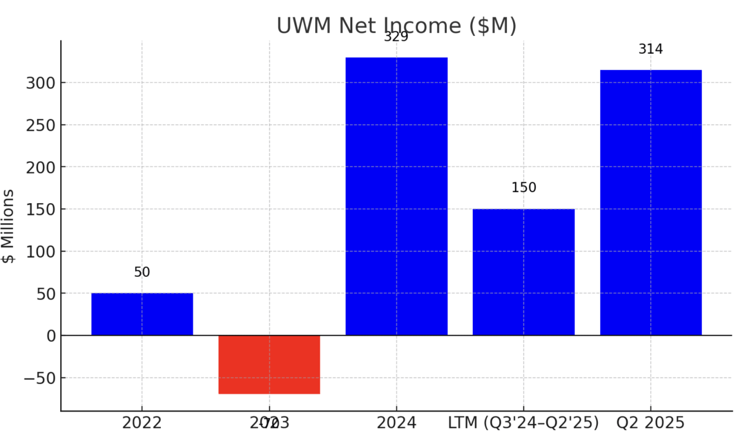 LTM (Latest Twelve Months): If we take Q3 2024 through Q2 2025 as LTM, UWM’s volume would be roughly ~$140B (since Q3 & Q4 2024 plus Q1 & Q2 2025 were all in the $25-40B range each). LTM revenue (excluding MSR marks) likely around $2.5B. LTM net income is harder to compute from external sources, but given Q3 2024 had net income ~$300M, Q4 2024 maybe around breakeven (with some MSR hit), Q1 2025 was a large loss of $247M[114], and Q2 2025 big profit $314.5M[115], the net of those four quarters is still positive (roughly $+150M). Adjusted for MSR noise, the core earnings power LTM is higher.