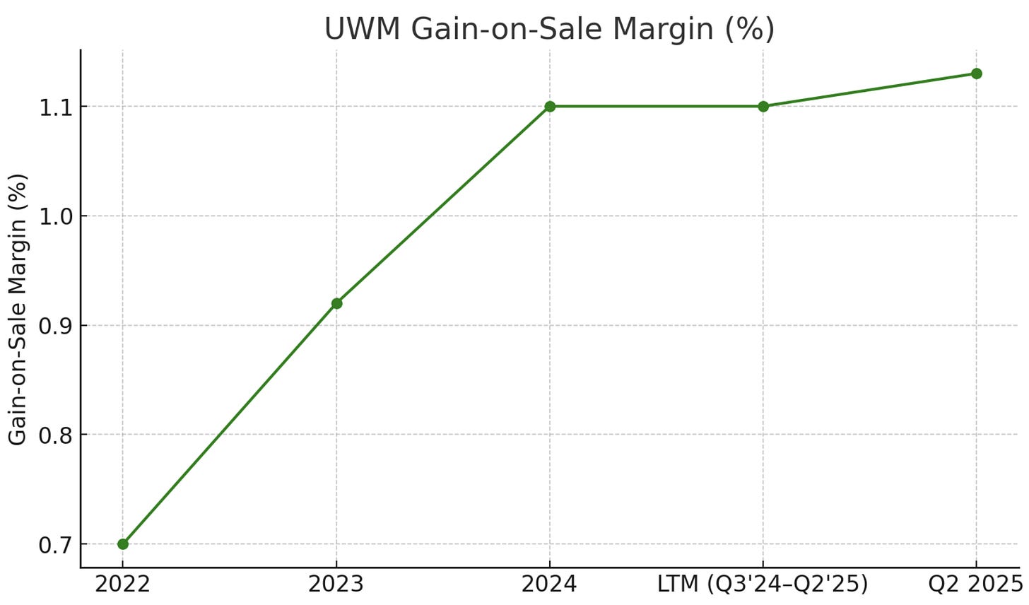 Loan production income (gain-on-sale) - when UWM funds a loan and then sells it (either directly to Fannie/Freddie or via securitization), it earns a gain equal to the difference between the loan’s value in the market (including servicing rights) and its cost basis. This gain-on-sale is typically expressed as basis points of the loan amount. For example, in Q2 2025 UWM’s total gain-on-sale margin was 113 bps (1.13%)[6], meaning on a $300k loan it realized about $3,390 in revenue. Gain-on-sale encompasses origination fees, interest spread during holding, and the value of the mortgage servicing right (MSR) retained.