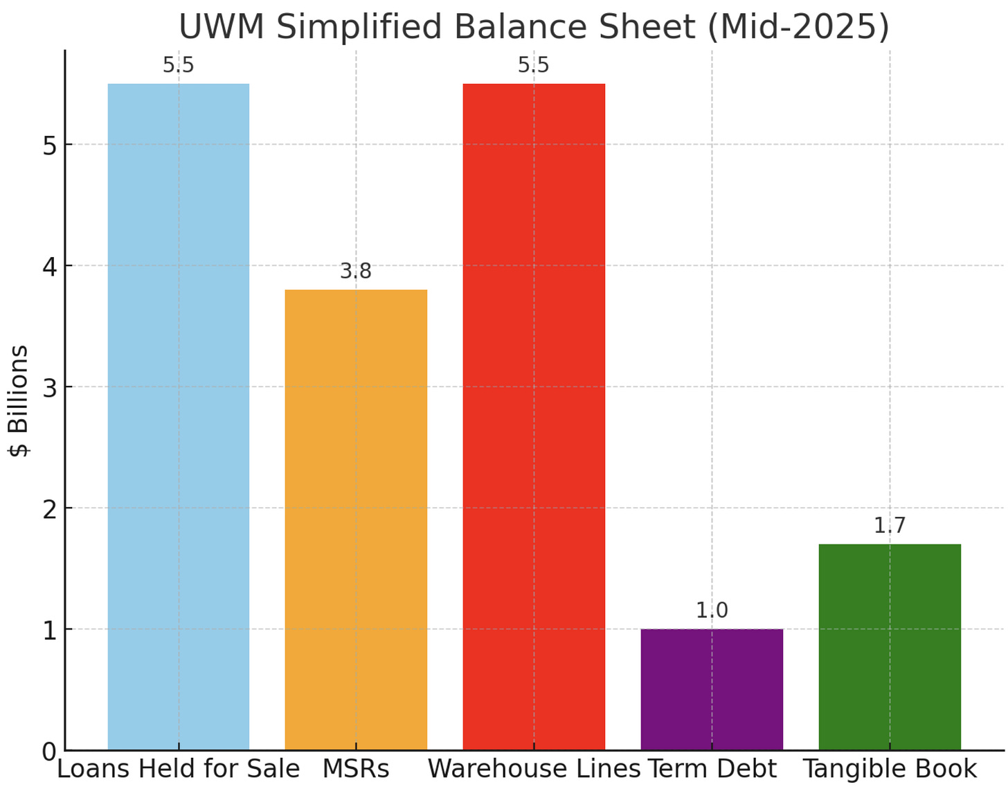 Balance Sheet & Capital Allocation: UWM’s balance sheet is relatively straightforward for a non-bank: mostly loans held for sale (short-term), MSRs (long-term asset), and liabilities of warehouse lines and some term debt. The company’s tangible book value at 6/30/2025 was about $1.7B[99]. However, the market cap (including Class D shares at market price) is much higher - around $10.8B implied[100]. This discrepancy is because MSRs and other intangibles mean price-to-tangible book is elevated, and investors value UWM on earnings power rather than book. It’s not unusual; Rocket also trades above book due to its MSR.