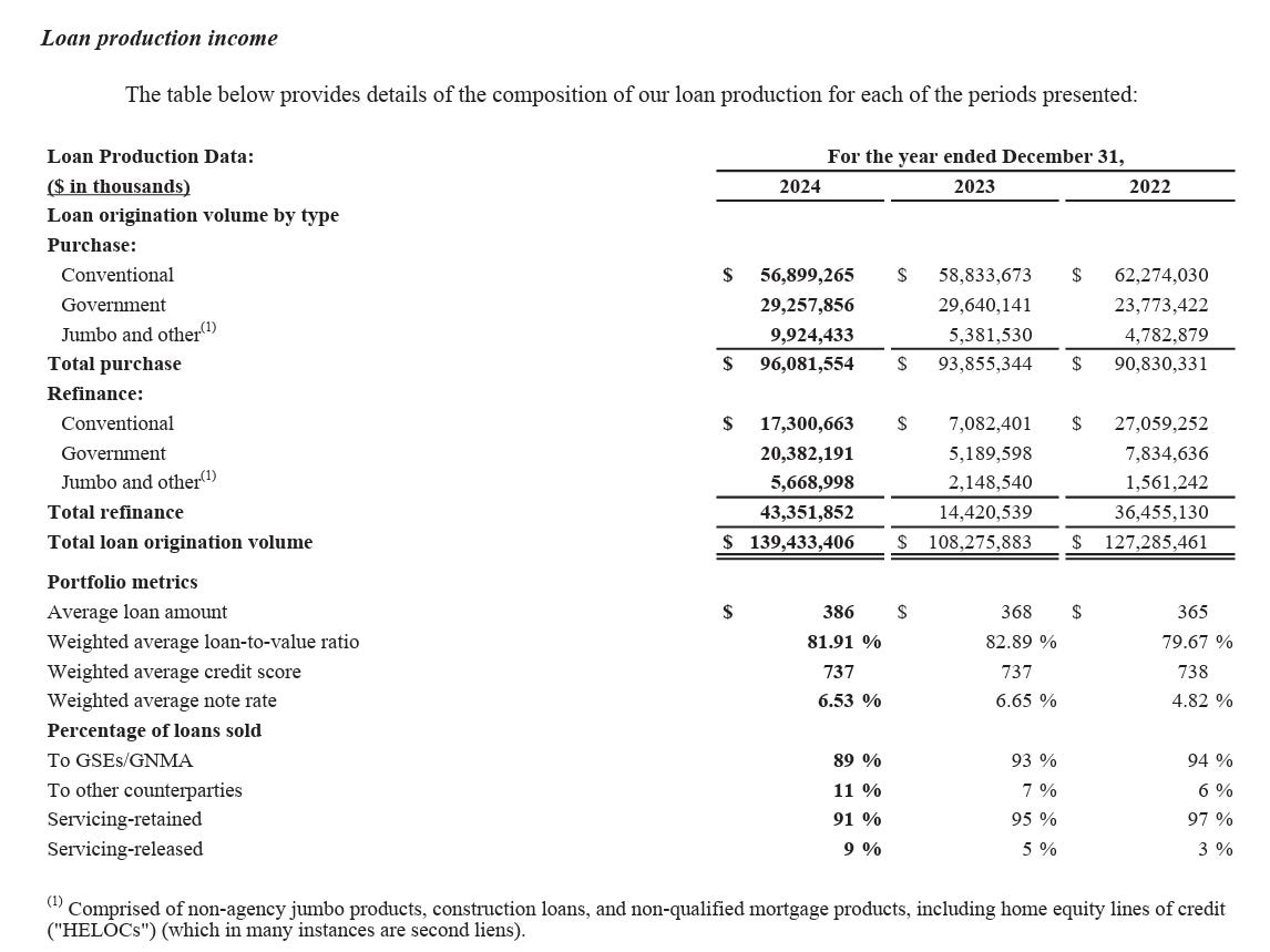 2024: A rebound year. UWM’s total originations jumped to $139.4B[110] (up 29% YoY from 2023’s $108B). Purchase volume hit a record $94B in 2024[111][112]. Importantly, gain-on-sale margins improved to around 1.10% for full-year 2024 (19% higher than 2023’s 92 bps)[76]. This was due to easing competitive pressure and higher average loan rates which can slightly boost gain on sale (with wider spreads on coupons). UWM’s GAAP net income for 2024 was reported as $329.4M[23] - a big swing back into the black. However, only $14.4M of that was attributable to Class A shareholders[113] due to the structure; the rest was non-controlling interest (Mat’s share).
