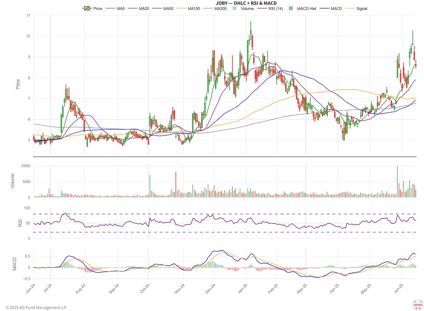 If you read ADFM’s May investor letter, you’ll see that I’m betting against China. Even though Chinese equities are doing well this year, my short book there has generated strong returns overall. On Friday, I closed my Alibaba BABA 0.00%↑ short and rolled the proceeds into two speculative eVTOL companies that currently have zero revenue: Archer Aviation ACHR 0.00%↑ and Joby Aviation JOBY 0.00%↑ .