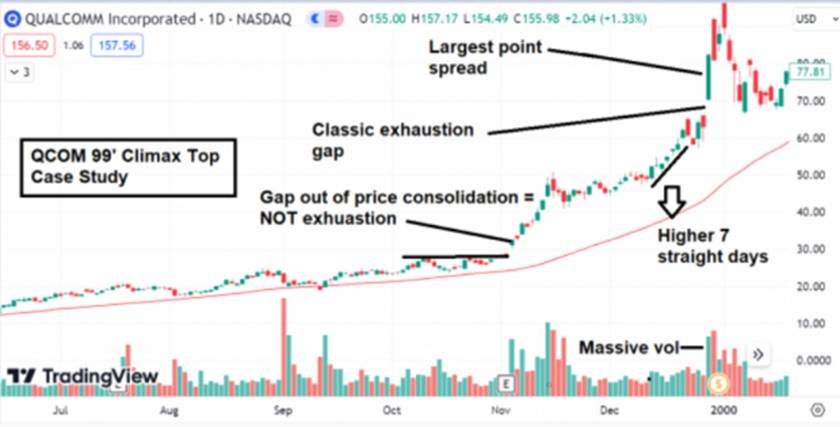 Climactic Volume Spike (Blow-off Volume): A volume climax is when trading volume explodes to many times average on the final rally. It indicates capitulation by shorts and a frenzy by late buyers, leaving nobody left to buy. William O’Neil, who studied climax runs, noted that often a leading stock’s largest one-day point gain and highest volume will occur at the end of its advance[38][39]. For instance, Qualcomm (QCOM) on Dec 29, 1999 jumped 39 points in one day on 142% of its average volume - its largest price jump and huge volume - a classic climax top day. It gapped up (exhaustion gap) and that marked the peak; QCOM never revisited those highs for decades. The combination of price surge + record volume = last buyers in, shorts squeezed out[40][41]. After that, only sellers remain. As a PM, when you witness a truly climactic day - say your stock that’s been soaring goes vertical with an outsized range and volume 4x normal - do not ignore it. It’s likely a blow-off. Maybe you won’t sell your entire position if fundamentals still seem good, but at least lighten up significantly. A real-world recent example: Super Micro Computer (SMCI) in early 2024 - it rallied over 3x in a few months, then in Feb 2024 it had 9 straight up days (nearly +100% in two weeks) on massive volume, including some gap-ups. That was a clear blow-off move. Sure enough, March 8, 2024 it peaked and then crashed in the following months. Those who sold into that frenzy kept their gains; those who didn’t round-tripped a lot of profit. Volume is the telltale - if you see the heaviest volume ever and a huge price extension, that is often the terminal rush. As one trader quipped, “when you see volume go insane on a vertical price spike, ring the register.”